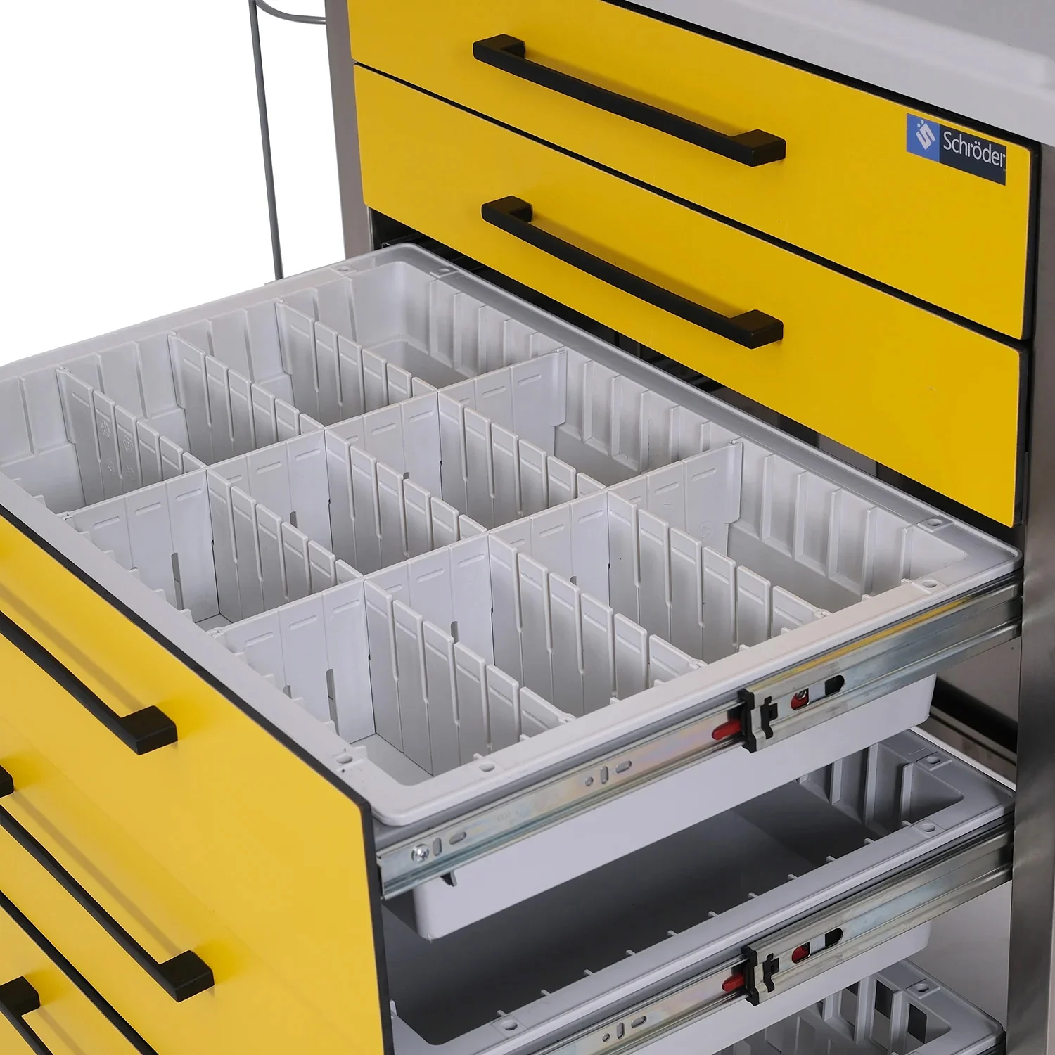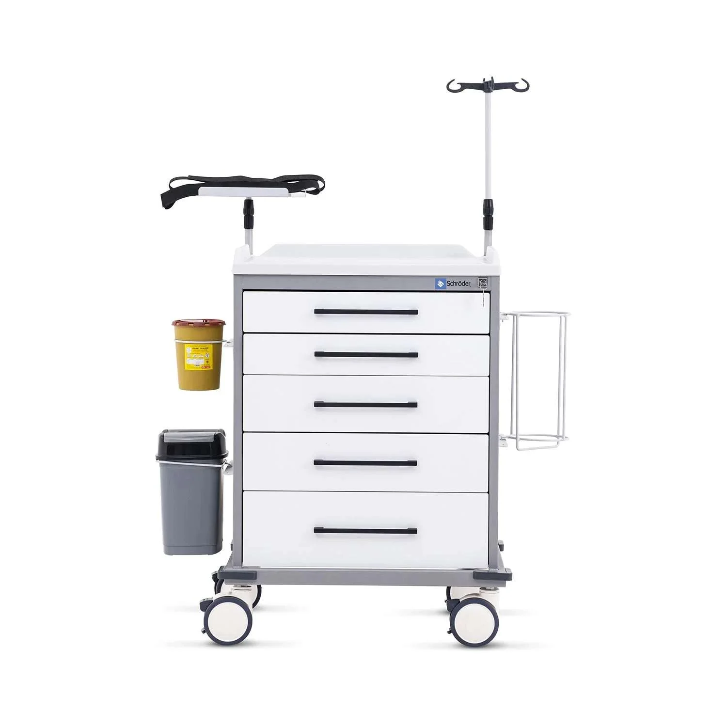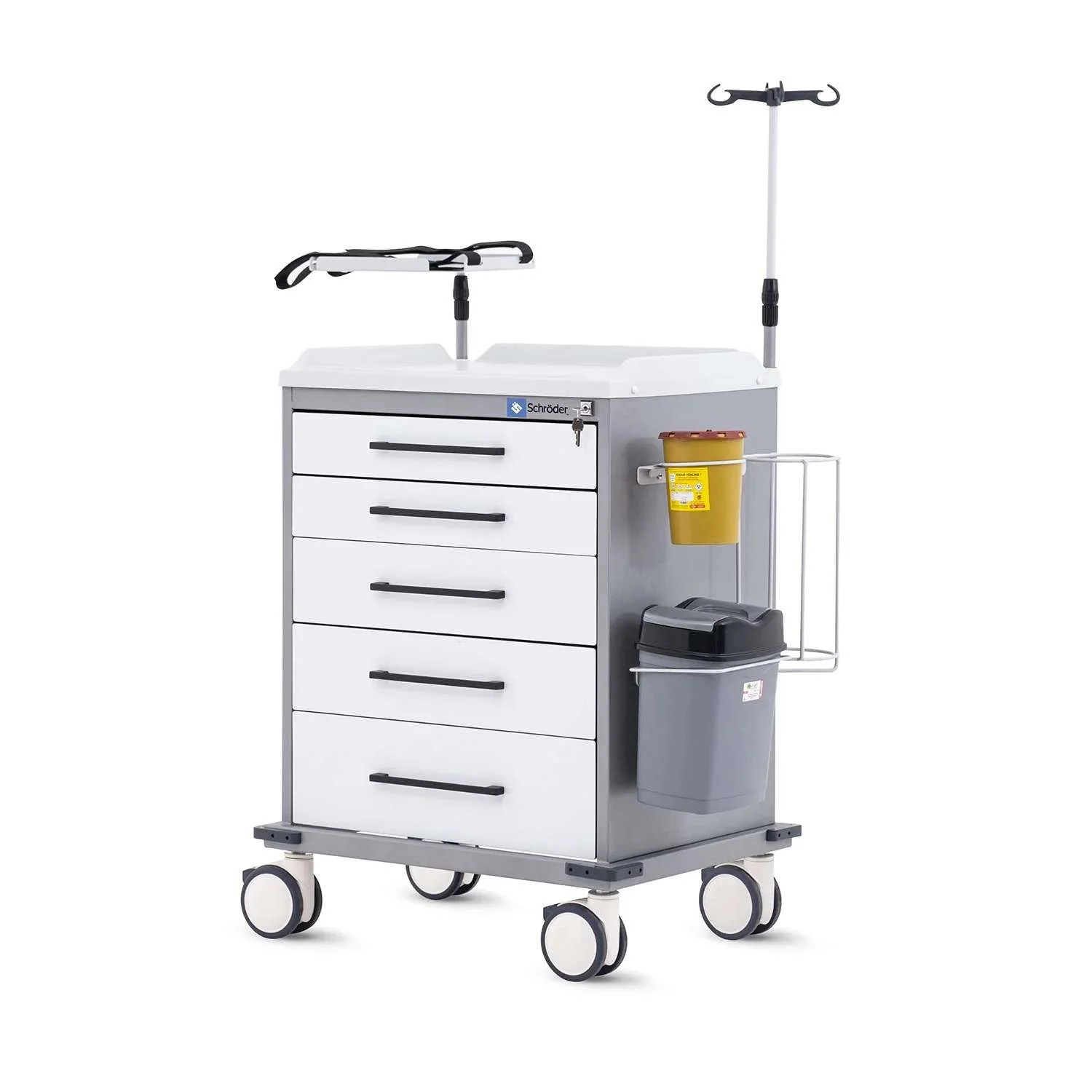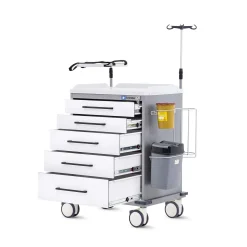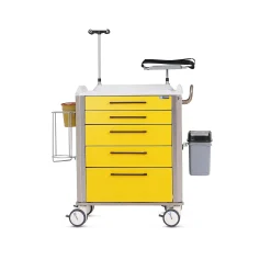 Το καρότσι επειγόντων είναι κατασκευασμένο εξ ολοκλήρου από ανοξείδωτο ατσάλι ποιότητας 304. Διαθέτει συρτάρια από compact laminate με κεντρικό σύστημα κλειδώματος. Η επάνω επιφάνεια περιλαμβάνει ενσωματωμένη βάση για απινιδωτή. Επίσης, είναι εξοπλισμένο με ενσωματωμένη θήκη για φιάλη οξυγόνου, ορόστατη, κάδο απορριμμάτων και επιφάνεια για CPR.