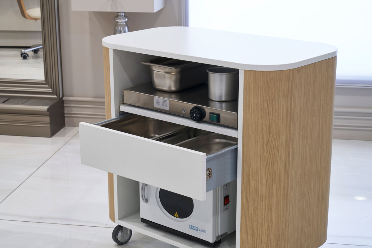 Τρόλεϊ από λευκό laminate με κυρτές πλευρές,επιφάνεια από laminate διαθέσιμη σε φινίρισμα ξύλου Nilo.